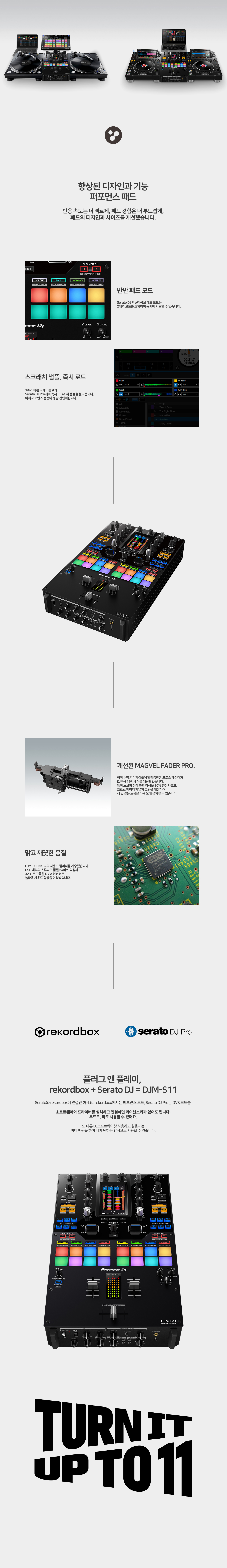 DJM-S11로 게임을 한 단계 업그레이드하세요. 이 새로운 프로페셔널 2채널, 4데크 컨트롤 배틀 믹서는 이전 모델인 DJM-S9의 다양한 요소를 강화하고, Serato DJ Pro 또는 rekordbox로 더 자유롭게 연주할 수 있도록 돕는 다양한 새로운 기능을 제공합니다.