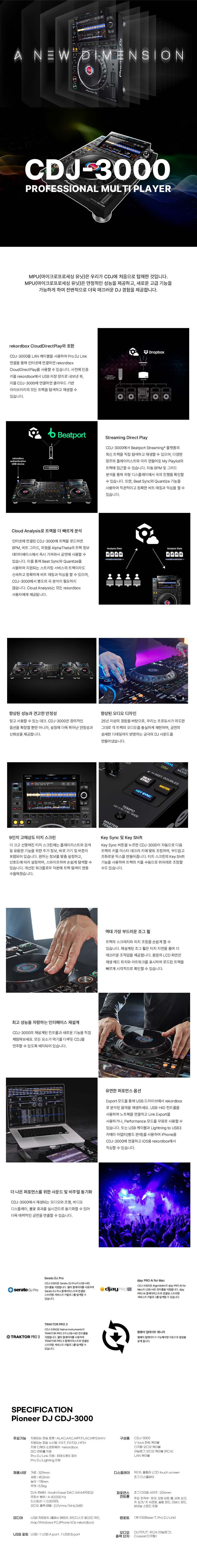 진화된 플래그십 멀티 플레이어 CDJ-3000으로 창의력을 강화하세요. 이 견고한 장치는 새로운 MPU로 구동되며 특별히 개발된 고품질 구성 요소와 혁신적인 기능이 가득합니다.